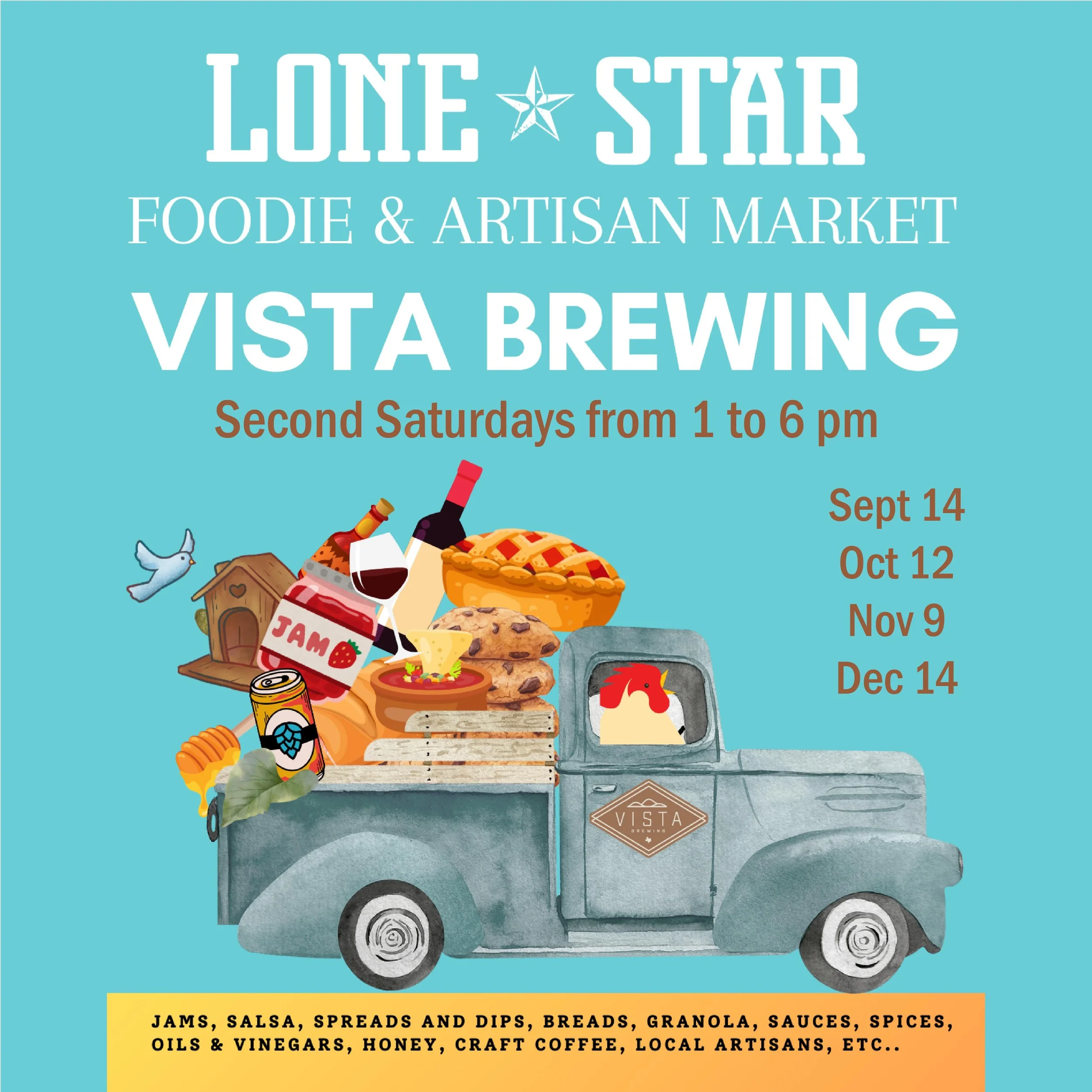 We’re welcoming our friends from Lone Star Farmer’s Markets to the Vista ranch every Second Saturday from 1 to 6 pm for a special foodie market! Find locally made gourmet food and craft artisans for your self or that special gift.